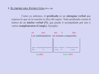 Este documento describe la estructura del predicado y sus elementos constituyentes. Explica que el predicado puede ser verbal u nominal. En el predicado verbal, el núcleo es un verbo predicativo que puede ir acompañado de complementos. En el predicado nominal, el verbo copulativo enlaza el sujeto con un atributo. También analiza las perífrasis verbales, que constan de un verbo auxiliar y un verbo auxiliado en forma no personal.