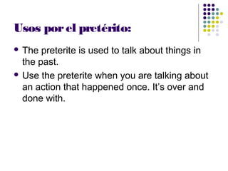 El documento describe los usos del pretérito para hablar de acciones en el pasado. Explica que el pretérito se usa para acciones que ocurrieron una vez, acciones repetidas durante un período de tiempo, y acciones que formaron parte de una serie de eventos. También proporciona ejemplos de conjugaciones regulares y verbos irregulares en el pretérito, incluidos los verbos "-car", "-gar", "-zar" y verbos muy especiales como "ir", "ser", "dar", "ver" y "hacer".