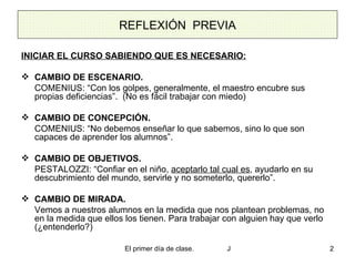 Este documento presenta la planificación de la primera jornada de clase de un curso escolar. Se destaca la importancia de ofrecer seguridad y confianza a los estudiantes, así como hacerlos sentir valorados. También se explican aspectos a considerar como conocer las características de los estudiantes, establecer objetivos claros y una metodología adecuada, y trabajar en la formación del grupo clase desde el primer día.