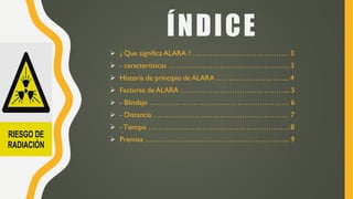 Este documento describe el principio ALARA (tan bajo como sea razonablemente alcanzable) para la protección radiológica. ALARA se rige por tres factores: blindaje, distancia y tiempo. El blindaje y la distancia de la fuente radiactiva reducen la exposición a radiación de acuerdo con la ley del cuadrado inverso. El tiempo de exposición también debe limitarse para minimizar la dosis total. ALARA busca optimizar la protección mediante la justificación y limitación de dosis mientras se mantiene la calidad del