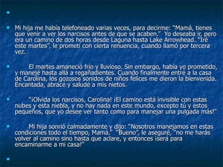 La autora visita a su hija y nietos a pesar del mal tiempo, y su hija la lleva a ver un jardín de narcisos compuesto por 50,000 bulbos plantados a lo largo de décadas por una mujer sola. El jardín muestra que se pueden lograr cosas magníficas trabajando pacientemente un paso a la vez hacia metas a largo plazo. La autora se inspira a empezar sus propios proyectos de forma gradual en lugar de esperar a condiciones ideales.
