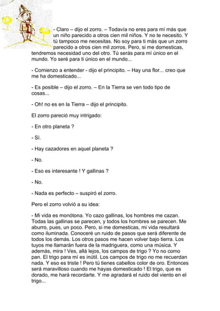 El principito encuentra a un zorro en el planeta y le pide jugar, pero el zorro le explica que no está domesticado. El principito no entiende qué significa "domesticar" y el zorro le explica que es crear un vínculo único entre dos seres donde cada uno se vuelve indispensable para el otro. El principito decide domesticar al zorro y pasan tiempo juntos creando ese lazo especial. Antes de irse, el zorro le da un secreto: lo más importante no se ve con los ojos, sino con el corazón.
