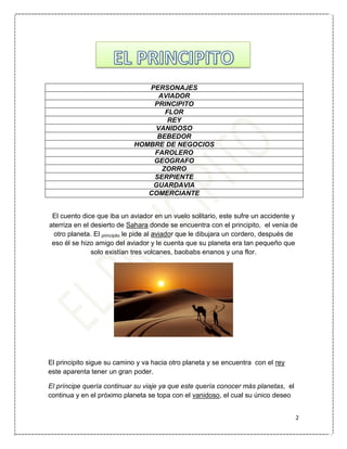 El documento resume la historia de "El Principito" donde un aviador conoce a un niño llamado el Principito en el desierto del Sahara. El Principito le cuenta al aviador sobre sus viajes a otros planetas donde conoce personas extrañas como un rey vanidoso, un hombre de negocios y un zorro con el que hace amistad. Años después, el aviador aún guarda la esperanza de volver a ver al Principito para devolverle su dibujo del cordero.