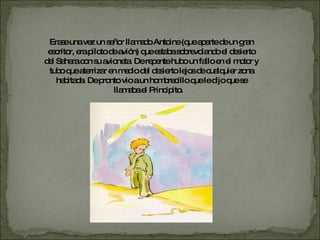 Antoine, un escritor y piloto francés, se vio obligado a realizar un aterrizaje de emergencia en el desierto del Sahara. Allí conoció a un extraño personaje llamado el Principito, quien le pidió que le dibujara un cordero varias veces hasta que Antoine lo dibujó en una caja. El Principito explicó que venía de un pequeño planeta y había visitado otros donde conoció a un rey vanidoso y a un empresario obsesionado con contar estrellas antes de llegar a la Tierra