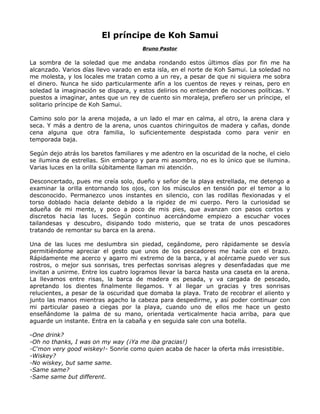 El documento describe la experiencia del autor como un "príncipe solitario" en la isla de Koh Samui. Mientras camina solo por la playa una noche, ve luces en la orilla y descubre a tres pescadores tratando de subir su barca a la arena. Ayuda a los pescadores y ellos, agradecidos, lo invitan a probar su licor de arroz casero. Aunque sabe mal, el licor lo reconforta. El autor reflexiona que prefiere ser un príncipe risueño en esta isla que un rey serio, y que mientras d