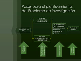 Este documento describe el proceso de planteamiento de un problema de investigación. Explica que este involucra indagar, informarse y diagnosticar la situación para reconocer los hechos y argumentar el problema. Luego se conceptualizan teorías y se documentan referentes empíricos para problematizar el tema y definir la pregunta de investigación. Finalmente, señala algunos errores comunes al plantear un problema e indica que la formulación de la pregunta es clave para dirigir la investigación de manera concreta.