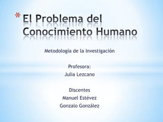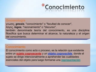 El documento habla sobre la gnoseología o teoría del conocimiento. Explica que la gnoseología busca determinar el alcance, la naturaleza y el origen del conocimiento. Luego describe diferentes tipos de conocimiento como el cotidiano, empírico, científico e intuitivo. Finalmente, proporciona ejemplos de situaciones que requieren diferentes tipos de conocimiento como usar una computadora, ser estudiante universitario, cambiar una llanta o dar medicamentos.