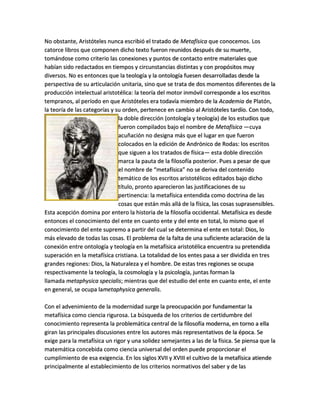 El documento describe la evolución del problema del ser como problema central de la filosofía desde los griegos hasta la actualidad. Comienza con los presocráticos y su interés por el origen de todas las cosas, luego pasa a Platón y Aristóteles y el desarrollo de la ontología y la teología. Más adelante analiza el surgimiento de la metafísica moderna con Descartes y la Ilustración, y la crítica de Kant a la metafísica tradicional. Finalmente, examina el idealismo alemán y la superación de la meta