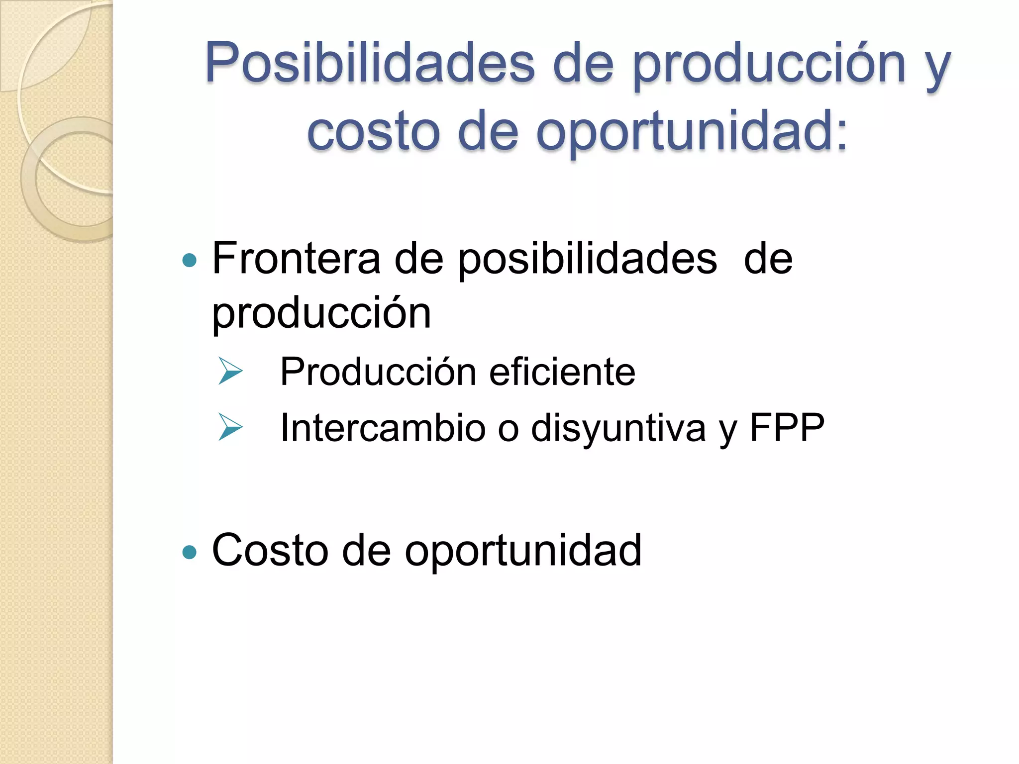 El documento describe conceptos económicos fundamentales como la frontera de posibilidades de producción, el costo de oportunidad, el crecimiento económico y la coordinación de mercado. Explica que la frontera de posibilidades de producción muestra la relación negativa entre la producción de dos bienes y que puntos como B son eficientes mientras que puntos como A no lo son. También define el costo de oportunidad como la mejor alternativa sacrificada y cómo este aumenta a medida que se produce más de un bien.