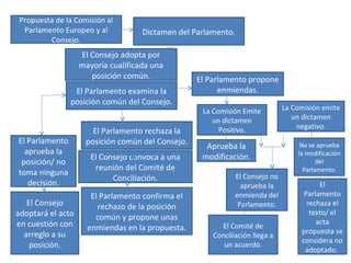 El procedimiento de codecición permite al Parlamento Europeo y al Consejo de la UE codificar juntos las propuestas legislativas de la Comisión Europea, con el Parlamento proponiendo enmiendas a la posición común del Consejo y celebrando reuniones de conciliación si es necesario llegar a un acuerdo.