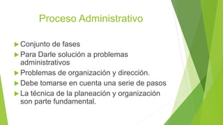 El proceso administrativo consta de cuatro fases: planeación, organización, dirección y control. La planeación implica definir objetivos y planes de acción. La organización establece la estructura de la empresa. La dirección se refiere a la influencia del administrador para implementar los planes. El control verifica que los resultados coincidan con los objetivos planeados. Juntas, estas cuatro fases buscan dar solución a problemas administrativos de una organización de manera eficiente.