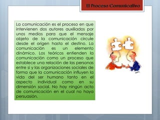 El documento describe los diferentes tipos de comunicación, incluyendo la comunicación verbal u oral, la comunicación no verbal que incluye el lenguaje corporal y las expresiones faciales, y la comunicación escrita. Explica que la comunicación es un proceso dinámico que involucra a dos partes y medios para transmitir un mensaje, y que influye tanto en el individuo como en la sociedad.