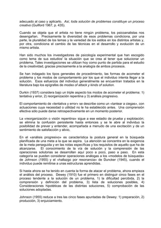 El documento describe el proceso creativo a través de las investigaciones de varios autores. Se dividen los enfoques en dos grupos: el acceso organizado y el acceso inspirado. El acceso organizado sigue las fases de preparación, producción y decisión propuestas por Arnold, mientras que el acceso inspirado sigue las cuatro fases de preparación, incubación, iluminación y verificación propuestas originalmente por Wallas. Ambos enfoques reconocen la importancia de la preparación inicial a través de la acumulación de conocimientos y experiencias.