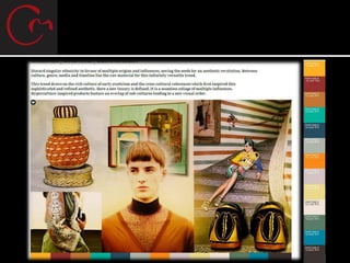 El documento aborda el desarrollo y análisis de un nuevo producto en la industria de la moda, centrándose en la importancia de las tendencias y la estrategia de diseño. Se discute la influencia de plataformas como WGSN en la identificación de tendencias clave para la creación de colecciones, así como la evolución histórica de la moda y su relación con la cultura y la identidad. Además, se destacan tendencias contemporáneas, como hypercultura, que fusionan elementos diversos para crear nuevas expresiones estéticas.