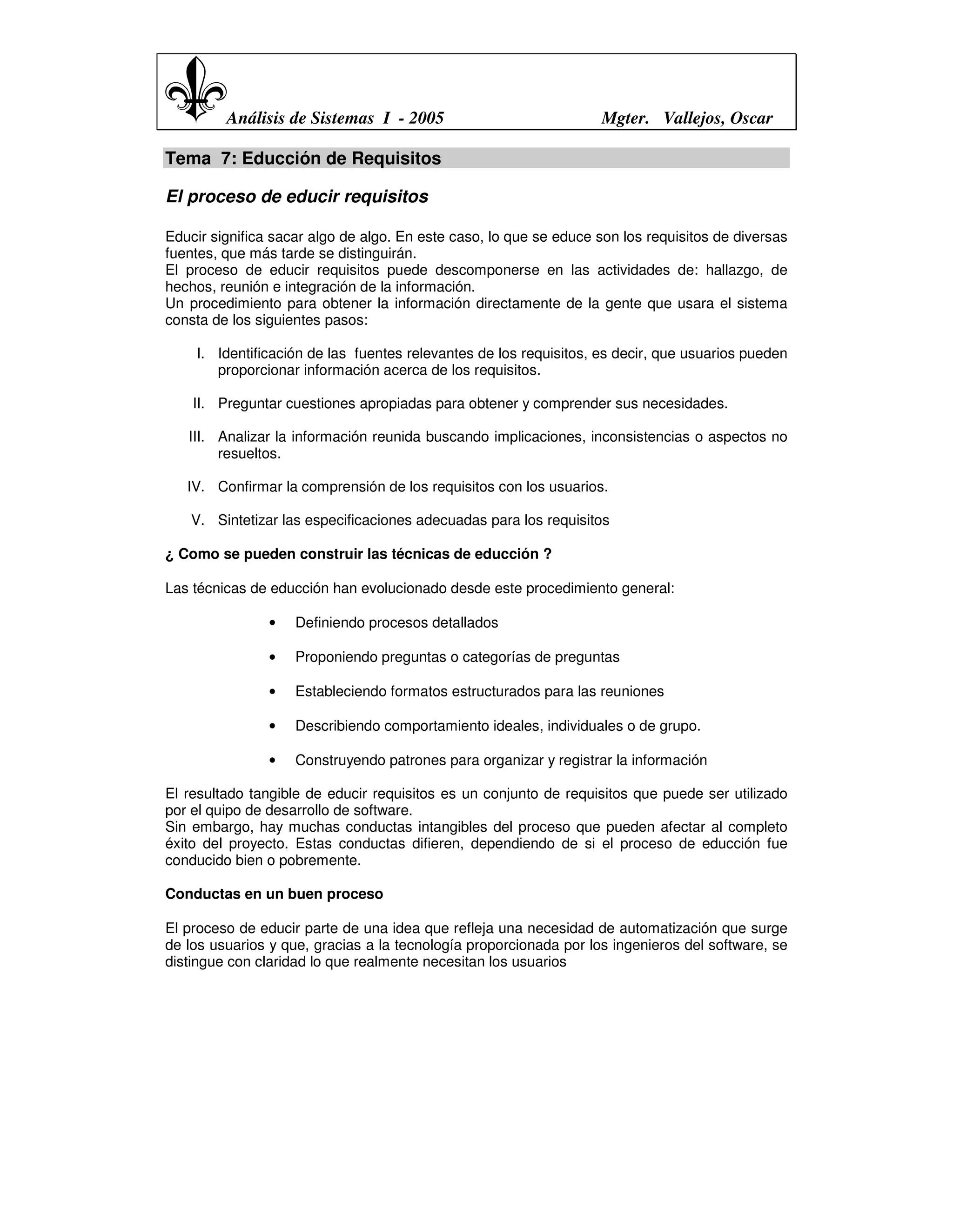 El documento describe el proceso de educir requisitos para el desarrollo de sistemas de software. Explica que este proceso implica identificar las necesidades de los usuarios a través de técnicas como entrevistas y cuestionarios. También analiza los posibles problemas en la educación de requisitos como limitaciones de alcance, problemas de comprensión y volatilidad de los requisitos.