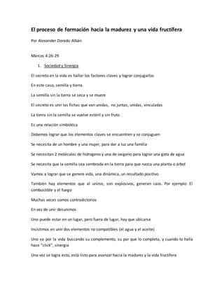 Este documento describe el proceso de formación hacia la madurez y una vida fructífera. Explica que este proceso requiere (1) lograr la sinergia entre los elementos claves como la semilla y la tierra, (2) estar preparados para el proceso a través de la disponibilidad de la semilla, la tierra fértil y la disposición a sembrar, y (3) el seguimiento continuo del proceso para asegurar que la semilla crezca y dé fruto. El proceso requiere fe, amor, comprender sus etapas y