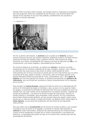 Este documento proporciona consejos para la preparación y grabación de un álbum musical. Recomienda ensayar con metrónomo, revisar los instrumentos, y escoger un estudio tras investigar sus trabajos anteriores. Explica que primero se graba la batería, luego el bajo, guitarra y otros instrumentos, guiándose por la base rítmica. Finalmente, se graban la voz y coros, y luego se limpian y mezclan las pistas.
