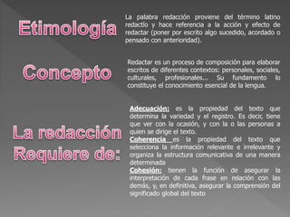 El documento habla sobre la redacción. Explica que redactar es el proceso de componer escritos de diferentes contextos y que requiere conocimiento de la lengua. También define algunos principios clave de la redacción como la adecuación, coherencia y cohesión.