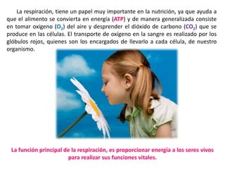 La respiración proporciona oxígeno a las células y remueve dióxido de carbono. El oxígeno es transportado a las células a través de la sangre, mientras que el dióxido de carbono es transportado de regreso a los pulmones para ser exhalado. Este proceso convierte la energía de los alimentos en una forma que las células pueden utilizar a través de reacciones químicas en las mitocondrias.