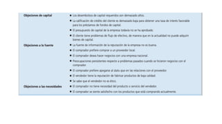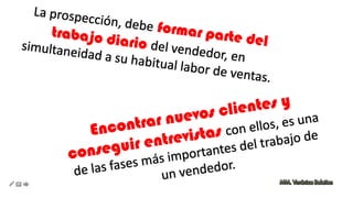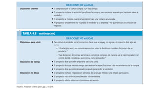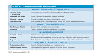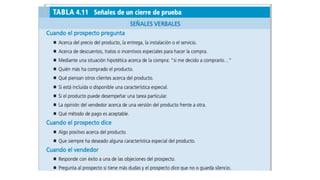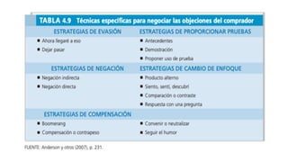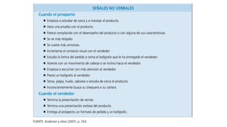 El documento describe las 7 etapas del proceso de ventas: 1) Prospección y calificación de clientes potenciales, 2) Planeación de la visita, 3) Abordar al prospecto, 4) Presentación y demostración, 5) Manejo de objeciones, 6) Cierre de la venta, y 7) Seguimiento y servicio posventa. Cada etapa incluye actividades clave como recolectar información sobre clientes, preparar la estrategia de venta, responder a preocupaciones del cliente, y mantener comunicación después de la venta para fidel