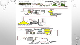 El documento describe el proceso de producción de azúcar a partir de la caña de azúcar. La caña se cosecha y transporta a los ingenios donde se pica, muele y extrae el jugo. Luego el jugo pasa por un proceso de clarificación, evaporación, cristalización y secado para producir azúcar cruda o refinada. El azúcar final se empaca y almacena para su venta y comercio.
