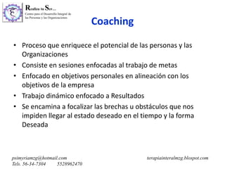 El documento describe un centro de desarrollo integral que ofrece sesiones de coaching para mejorar el potencial de individuos y organizaciones, enfatizando la alineación de objetivos personales y empresariales. Expone la curva de aprendizaje y los principios de sistemas que afectan el cambio y la adaptación en las organizaciones, resaltando la importancia de la perseverancia para sustituir viejos patrones por nuevos más efectivos. Se proponen métodos para mantener el cambio, incluyendo talleres y sesiones de coaching, para fomentar conductas positivas en un entorno organizacional.