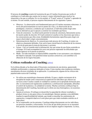 El documento describe el proceso de coaching, incluyendo los 5 pasos principales (observar, toma de conciencia, determinación de objetivos, actuar, medir). También discute varias modalidades de coaching como el coaching sistémico, ontologico, de vida, ejecutivo y deportivo. Finalmente, analiza las criticas al coaching como la falta de una metodologia definida y su enfoque en el exitismo, asi como la efectividad del coaching cuando es practicado por profesionales calificados.