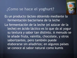 El documento explica cómo hacer yogur en casa en 5 pasos: 1) mezclar leche y yogur natural, 2) mantener la mezcla a una temperatura de 40 grados durante 8 horas para que las bacterias conviertan la leche en yogur, 3) una vez fermentado la leche se habrá espesado y tendrá el sabor característico del yogur.