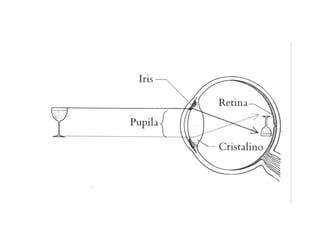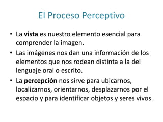El documento describe el proceso de percepción visual, incluyendo las fases del proceso perceptivo, los factores que afectan la percepción como el tiempo y el espacio, y teorías como la de Gestalt. Explica que la percepción comienza con un estímulo, pasa por receptores, el sistema nervioso y el cerebro, donde se integra la información.