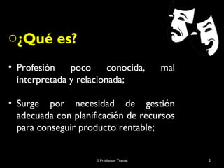 El documento describe el rol del productor teatral. Un productor teatral es responsable de gestionar los recursos y elementos necesarios para llevar a cabo un proyecto teatral, coordinando aspectos como la escenografía, vestuario, maquillaje e iluminación. También se encarga de encontrar una sala adecuada, atender al público y promover la obra. Para ser un buen productor, se recomienda tener formación artística, habilidades de gestión, ser flexible y tener capacidad de comunicación.