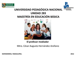 Este documento presenta el tema 2 de una maestría en educación básica sobre los procesos de mediación pedagógica. El tema analiza tres artículos sobre la mediación cultural, el profesor mediador, y la nueva función del profesor como arquitecto del conocimiento. Se espera que los estudiantes reflexionen sobre su papel como mediadores, analicen su práctica educativa, y apliquen estrategias de enseñanza. Como actividad, los estudiantes deben crear un cuadro sinóptico sobre el tema del