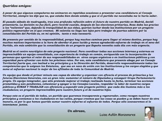 Luisa Auñón Manzanares presenta su candidatura al Consejo Territorial de Madrid de UPyD tras una profunda reflexión sobre el futuro del partido. Explica que se presenta por sentido de responsabilidad para consolidar el proyecto de UPyD en Madrid de cara a los próximos retos como las elecciones generales. Su objetivo es liderar un equipo integrador capaz de fortalecer el trabajo del partido y aumentar el número de diputados.