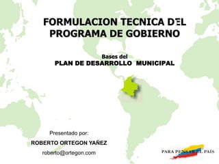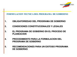 El documento presenta las bases para la formulación técnica de un programa de gobierno municipal. Explica que el programa de gobierno es obligatorio y vinculante según la Constitución y la ley, y debe formularse teniendo en cuenta las condiciones constitucionales y legales. También describe el proceso de formulación del programa de gobierno y ofrece recomendaciones para un programa exitoso.