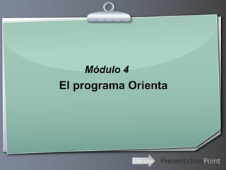 El documento describe el Programa Orienta de la Universidad de Valladolid, cuyo objetivo es proveer tutorías personalizadas para estudiantes de primer año. El programa se justifica legalmente y busca facilitar la integración de los estudiantes, mejorar la calidad de las titulaciones, y optimizar el aprendizaje. Se implementa a través de cinco fases que incluyen entrevistas, seminarios, y seguimiento del rendimiento académico, con el fin de orientar a los estudiantes y evaluar el programa.