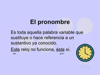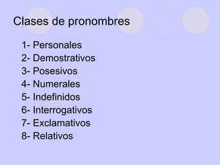 Este documento proporciona una descripción detallada de las diferentes clases de pronombres en español, incluyendo personales, demostrativos, posesivos, numerales, indefinidos, interrogativos, exclamativos y relativos. Define cada clase y ofrece ejemplos para ilustrar sus usos.