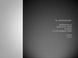 Un protoboard es una tabla con orificios para insertar componentes electrónicos sin necesidad de soldadura. Permite armar circuitos de forma rápida y modular mediante laminillas metálicas que conectan los componentes. Está compuesto de material aislante como plástico con perforaciones cada 2.54 mm para ajustarse a los pines estándar de los componentes electrónicos.