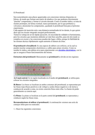 El documento describe un protoboard, que es una placa con orificios para insertar componentes electrónicos y probar circuitos de manera temporal. Un protoboard tiene líneas verticales conectadas y líneas horizontales desconectadas. Se usa para probar rápidamente circuitos sencillos antes de implementar versiones permanentes.