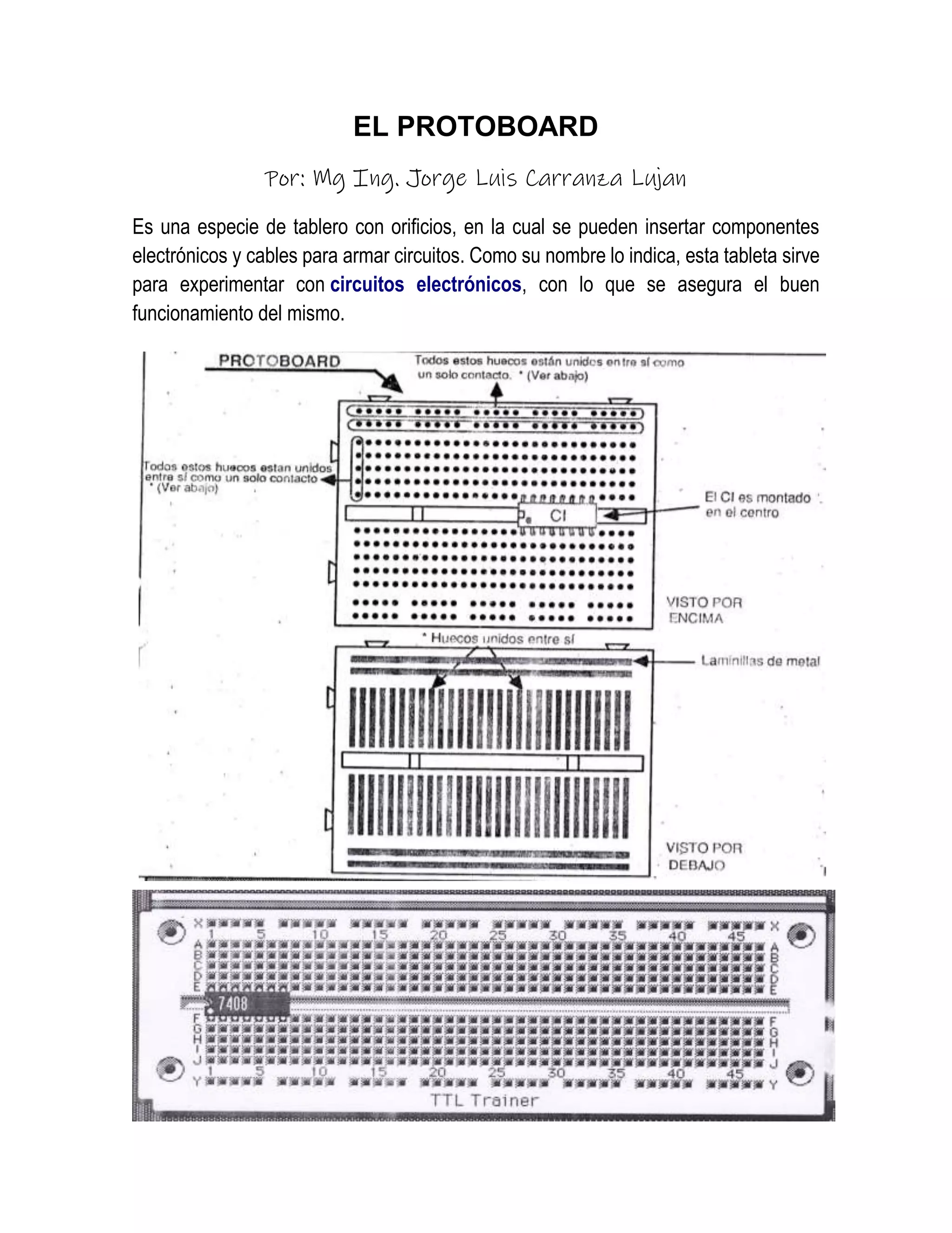 El documento describe un protoboard, que es un tablero con orificios para insertar componentes electrónicos y cables para armar circuitos de manera experimental. Explica cómo se instalan los circuitos integrados en el protoboard y describe internamente el circuito integrado 7408, que contiene 4 puertas AND. También brinda información sobre el autor del artículo.