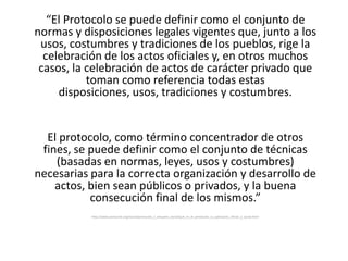 Este documento describe la importancia del protocolo en las instituciones públicas y privadas. Explica que el protocolo establece normas para la organización correcta de eventos y actos a través de detalles como el orden de las personalidades, himnos, banderas y tiempo de intervenciones. También destaca que tanto las instituciones públicas como privadas deben cuidar su imagen a través de la aplicación del protocolo.