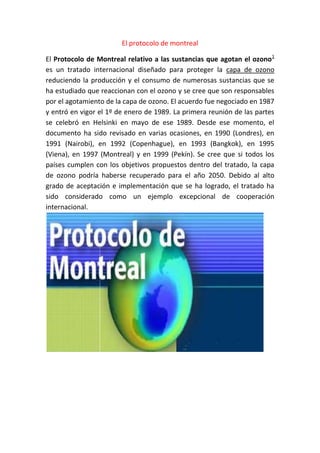 El Protocolo de Montreal es un tratado internacional diseñado para proteger la capa de ozono mediante la reducción de sustancias que reaccionan con el ozono y son responsables de su agotamiento; el acuerdo fue negociado en 1987 y ha sido revisado varias veces para fortalecer sus objetivos con el fin de que la capa de ozono se recupere para 2050 si se cumplen sus metas.