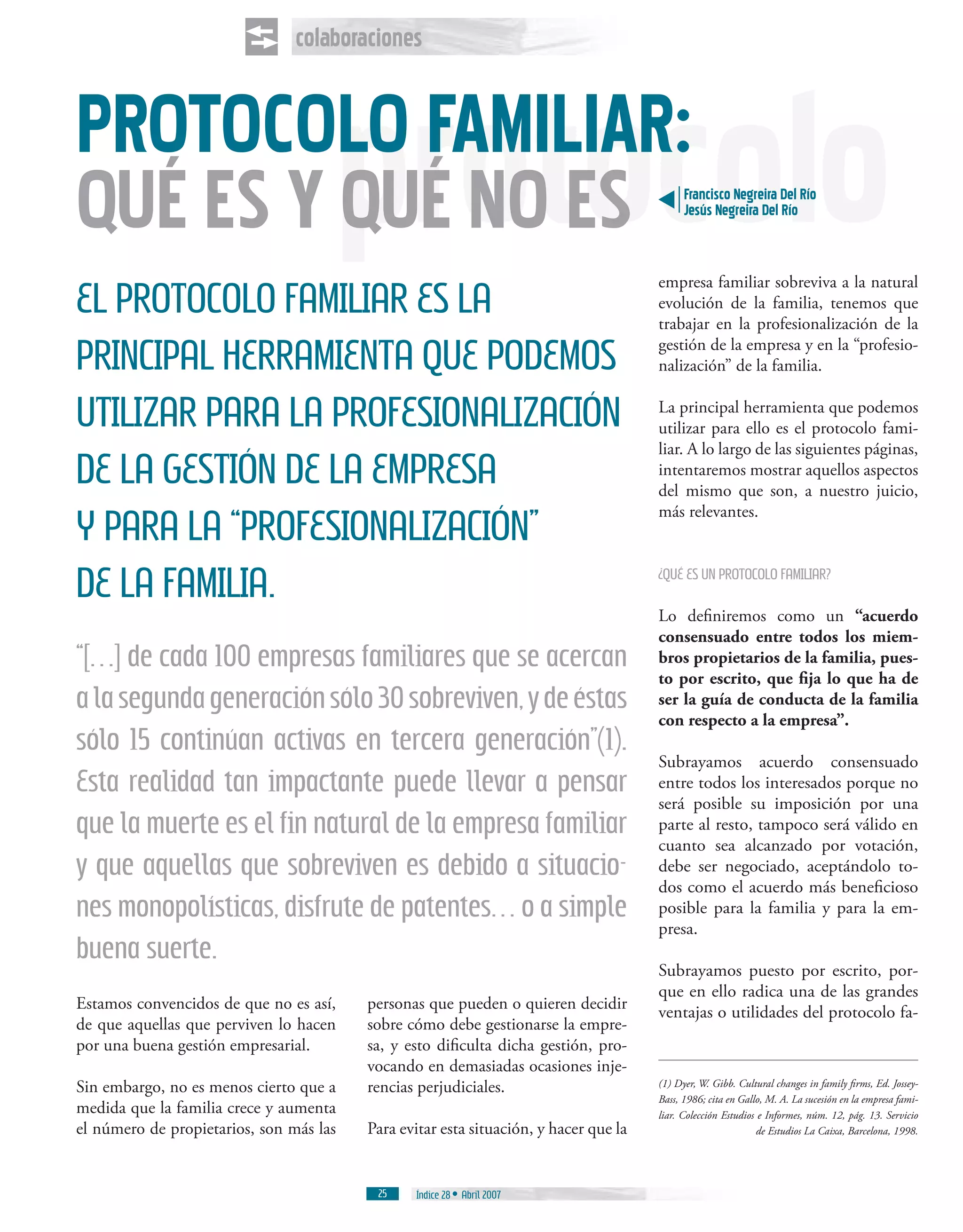 El documento habla sobre los protocolos familiares y su importancia para la profesionalización de la gestión empresarial y de la familia. Explica que un protocolo familiar es un acuerdo escrito entre los miembros de la familia que establece las pautas de conducta respecto a la empresa. También destaca algunos temas clave que deben tratarse en el protocolo, como la incorporación de familiares, el reparto de dividendos y el modelo de relación entre la familia y la empresa.