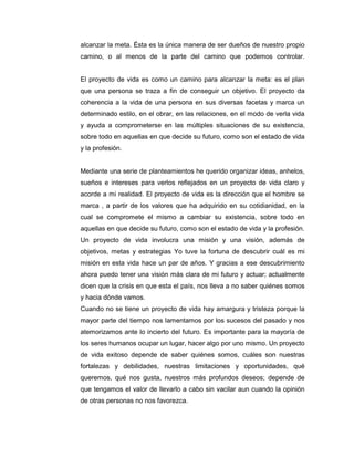 Este documento presenta una introducción al concepto de proyecto de vida y sus elementos fundamentales. Explica que un proyecto de vida es un plan trazado por una persona para alcanzar objetivos y metas que le den sentido a su existencia. Incluye secciones sobre la visión, misión, metas y objetivos de un proyecto de vida, así como ejemplos y pasos para elaborar el propio proyecto de vida.
