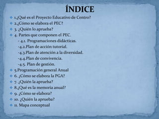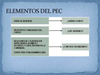 El documento describe los componentes clave del Proyecto Educativo de Centro (PEC), incluyendo su elaboración, aprobación y partes constitutivas. El PEC establece la filosofía educativa a largo plazo del centro, mientras que la Programación General Anual y la Memoria Anual evalúan y actualizan los planes de implementación anualmente. El PEC es elaborado y aprobado por toda la comunidad educativa y otorga autonomía al centro.