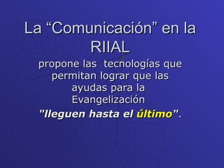 Este documento describe la Red de Informática e Información de la Iglesia en América Latina (RIIAL), la cual busca llevar las ayudas para la evangelización hasta el último nivel de la Iglesia a través de la comunicación. Explica que la Conferencia Episcopal es el promotor de la red y las diócesis son el núcleo y destinatario principal de sus servicios. También destaca la importancia de que los obispos participen activamente en definir cómo se implementa la RIIAL a nivel local utilizando todas las tecnologías dispon