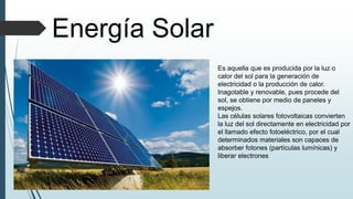 El documento presenta un proyecto de energía solar liderado por 6 integrantes. Describe que la energía solar se obtiene de la luz o el calor del sol mediante paneles y espejos, y que las células solares convierten la luz directamente en electricidad. Enumera los beneficios de la energía solar como ser renovable, no contaminante y contribuir al desarrollo sostenible. Explica que la energía solar funciona calentando un fluido con espejos u obteniendo electricidad directa de los paneles fotovoltaicos.