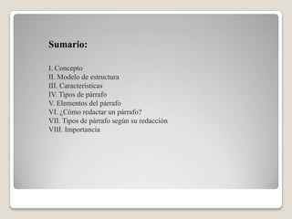Este documento define el párrafo y sus elementos. Explica que un párrafo está formado por una idea central y oraciones de apoyo, y que debe tener unidad y coherencia. Describe diferentes tipos de párrafos como cronológicos, de enumeración y descriptivos. También cubre cómo redactar párrafos y diferentes estilos como el párrafo ordinario y en bloque. Finalmente, destaca la importancia del párrafo para estructurar el contenido de un texto de manera organizada.