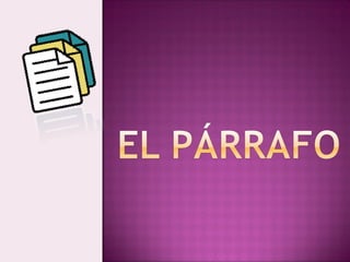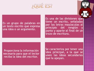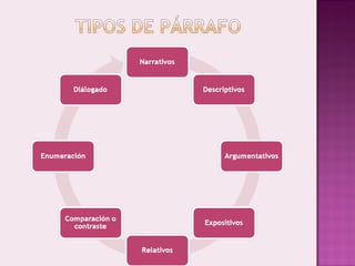 El documento describe las características de los párrafos y oraciones. Explica que un párrafo contiene una oración principal y oraciones secundarias subordinadas o coordinadas. También habla sobre la coherencia en la organización lógica de las oraciones dentro de un párrafo. Además, define dos formatos de párrafo, el francés y el de sumario.
