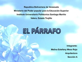 El documento define lo que es un párrafo y explica que está compuesto de una idea principal con desarrollo lógico. Describe los diferentes tipos de párrafos, incluyendo expositivos, narrativos, comparativos, de causa-efecto, deductivos e inductivos. Finalmente, explica que un párrafo debe mantener coherencia y unidad.