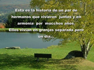 Este documento narra la historia de dos hermanos que vivían en granjas separadas y cayeron en un conflicto después de décadas de cultivar juntos en armonía. Un carpintero desconocido llegó ofreciendo su ayuda y el hermano mayor le pidió que construyera una cerca para separarlos, pero en su lugar el carpintero construyó un puente que unió a los hermanos nuevamente.
