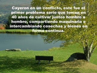 Dos hermanos que habían vivido en armonía por 40 años cultivando sus granjas juntas entraron en conflicto por un malentendido. Cuando uno contrató a un carpintero para construir una cerca que los separara, el carpintero construyó un puente que los unió nuevamente.